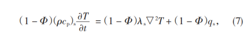 兩種能量增加帶來的溫升是基于多孔介質(zhì)材料內(nèi)的固體部分。假設(shè)固體部分的密度表示為ρs,其比熱容表示為cs。假定研究對象熱物性參數(shù),如比熱容、導(dǎo)熱系數(shù)等,不受到時(shí)間和空間改變帶來的影響,多孔介質(zhì)本身始終為各項(xiàng)同性的,并且多孔介質(zhì)材料內(nèi)部細(xì)小孔隙的容積均被流體填充,則有: