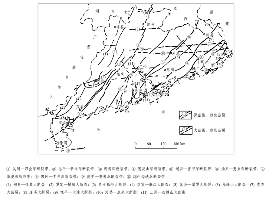 廣東省在大地構(gòu)造上屬華南褶皺系的一部分,其演化過程經(jīng)歷了三個發(fā)展階段及相應(yīng)的構(gòu)造旋回和構(gòu)造運動:加里東運動形成緊密線型褶皺,主要呈NEE方向,成為廣東省構(gòu)造骨架的基礎(chǔ);印支運動形成多方向的過渡型蓋層褶皺;燕山運動以斷塊造山、NE向和EW向深大斷裂控制的火山噴發(fā)、巖漿侵入為主。深大斷裂對廣東省的沉積建造、巖漿活動、變質(zhì)作用和成礦作用有較明顯的控制。主要的深斷裂有吳川-四會、恩平-新豐、河源、蓮花山、潮安-普寧、汕頭-惠來、南澳、佛岡-豐良、高要-惠來、瓊州海峽等,主要的大斷裂有郴縣-懷集、羅定-悅城、貴子、信宜-廉江、紫金-博羅、九峰山、貴東、遂溪、饒平-大埔、河婆-惠來、三洲-西樵山等。這些深大斷裂都具有規(guī)模大、活動時間長等特點。從總體上看。廣東省境內(nèi)大型褶皺和深大斷裂以NE向為主,間夾EW向和NW向構(gòu)造組成復(fù)雜的構(gòu)造圖景。