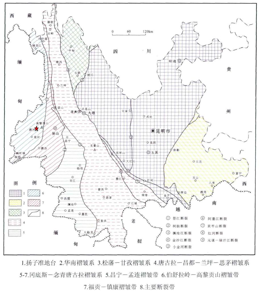 圖1 云南騰沖縣地理位置圖 2.項(xiàng)目區(qū)地質(zhì)背景 騰沖縣位于高黎貢山西側(cè),總體地勢北高南低,山脈走向?yàn)楸睎|一西向及南北向,與區(qū)域構(gòu)造線基本一致。高黎貢山與怒江并列向南蜿誕,高黎貢山峰脊一線海拔多在3000m以上;而怒江河谷海拔僅500—900m,區(qū)內(nèi)最高峰為高黎貢山中段的大腦子,海拔3780.9m;最低點(diǎn)為盈江縣拉沙河與穆雷江交匯處,海拔僅210m;最大高差達(dá)3570.9m,一般高差在400—2000m之間,屬中高山中一深切割地區(qū)。縣城西側(cè)為高中山地貌景觀,谷深坡陸;東側(cè)為中山山地稍為平緩,但切割密度較大;中部為斷陷谷地,河流階地發(fā)育,地勢平坦開闊。騰沖地區(qū)構(gòu)造運(yùn)動活躍、斷裂構(gòu)造發(fā)育、巖漿活動頻繁、火成巖分布廣泛、新生代火山活動、現(xiàn)代水熱活動異常強(qiáng)烈,溫沸泉眾多。